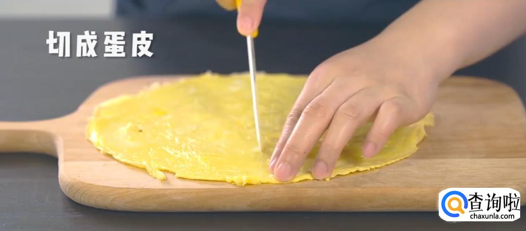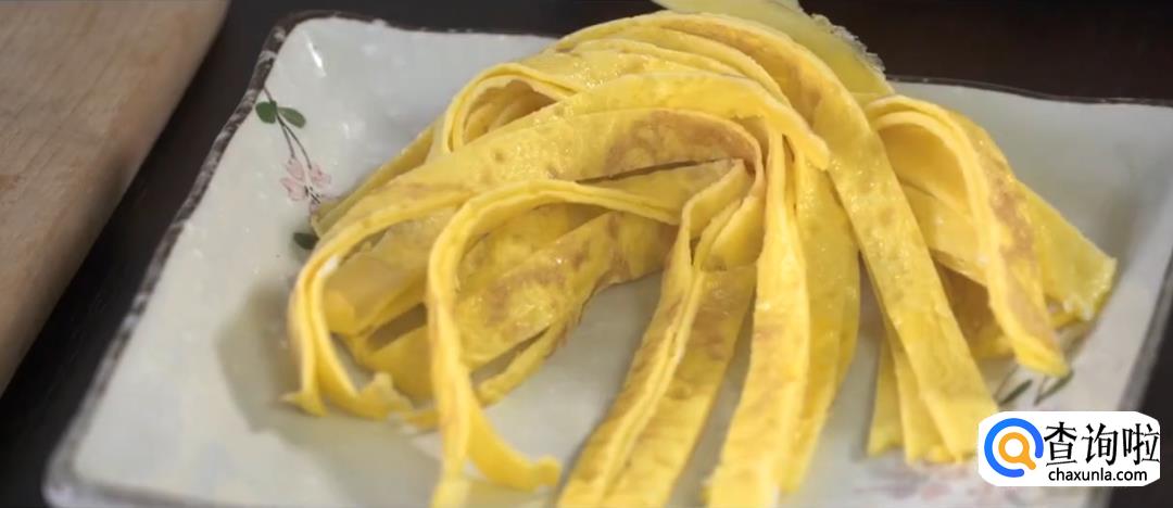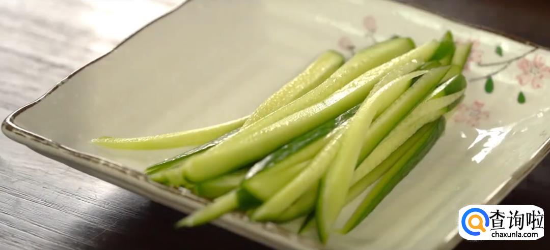 将蛋饼切成蛋皮丝,黄瓜切丝。