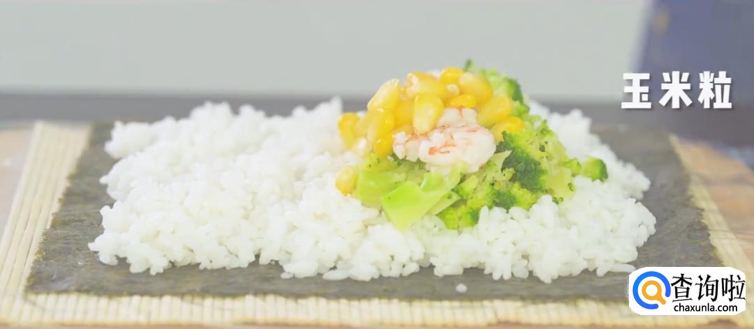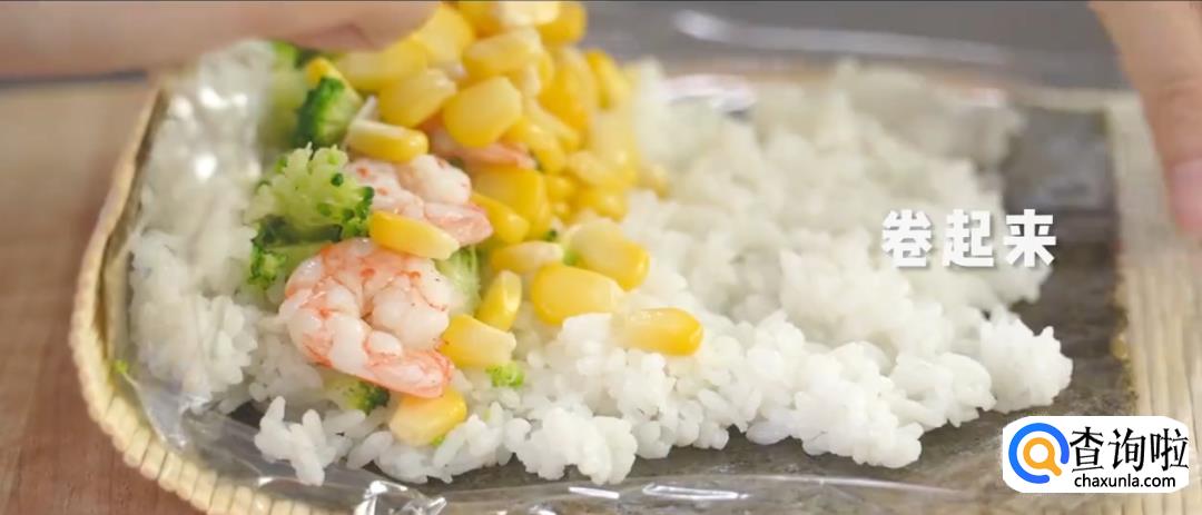 保鲜膜撕成合适大小,铺上海苔片,将米饭均匀地铺在上面压平,然后放上西蓝花,基围虾,玉米粒。