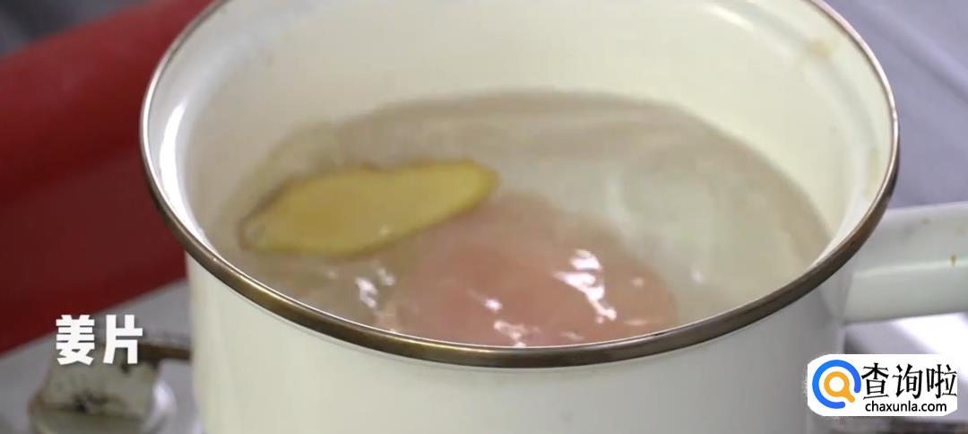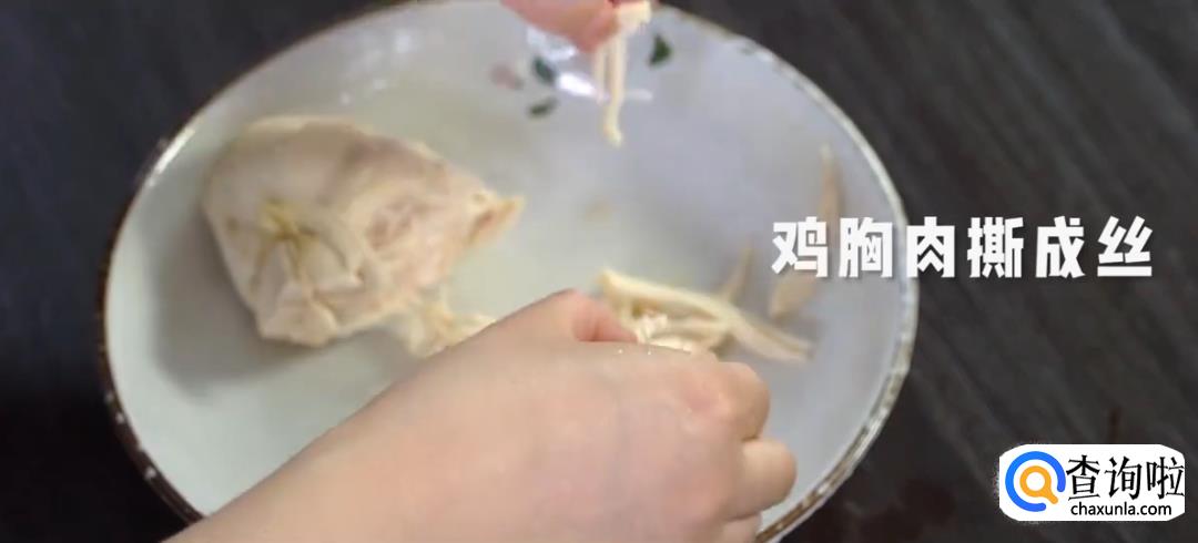 鸡胸肉加姜片下沸水焯水,煮熟后用手撕成鸡丝。