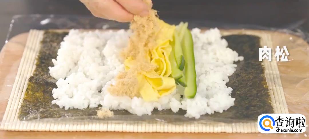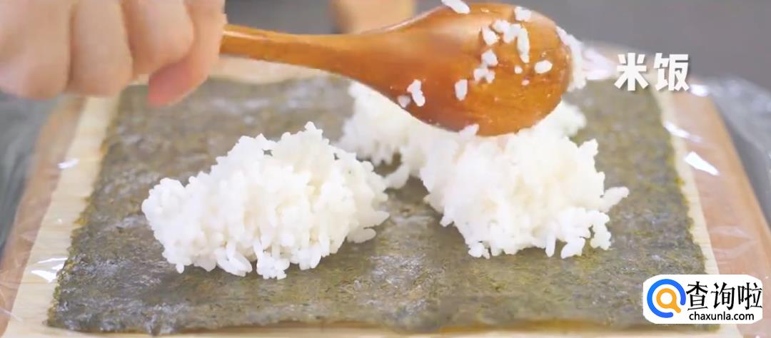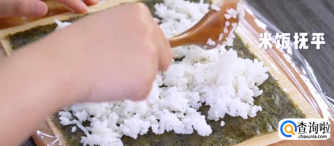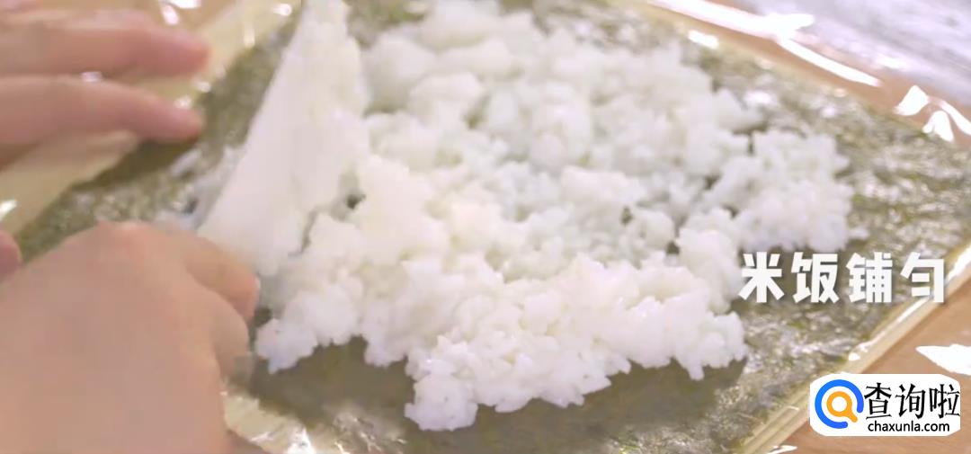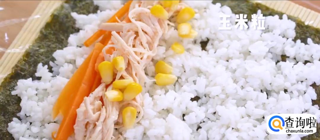 保鲜膜撕成合适大小,铺上海苔片,将米饭均匀地铺在上面压平,然后放上胡萝卜丝,玉米粒,鸡胸肉丝。