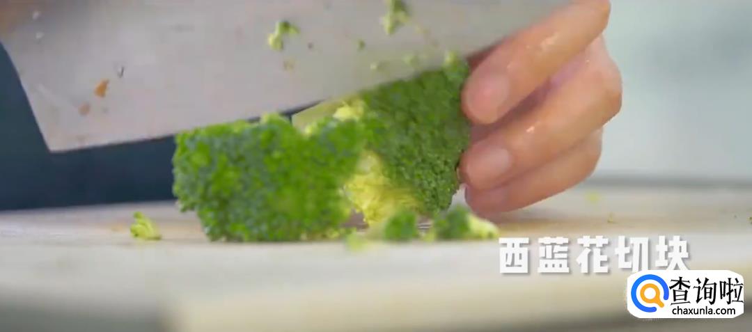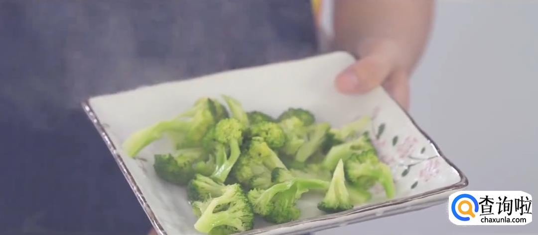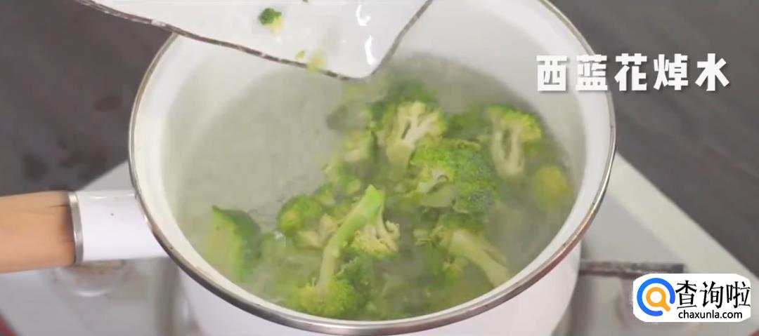 西蓝花洗净切块,下锅焯水后捞出。