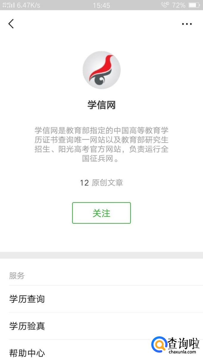 关注成功后,进入界面,点击左下角的“学历查询”。