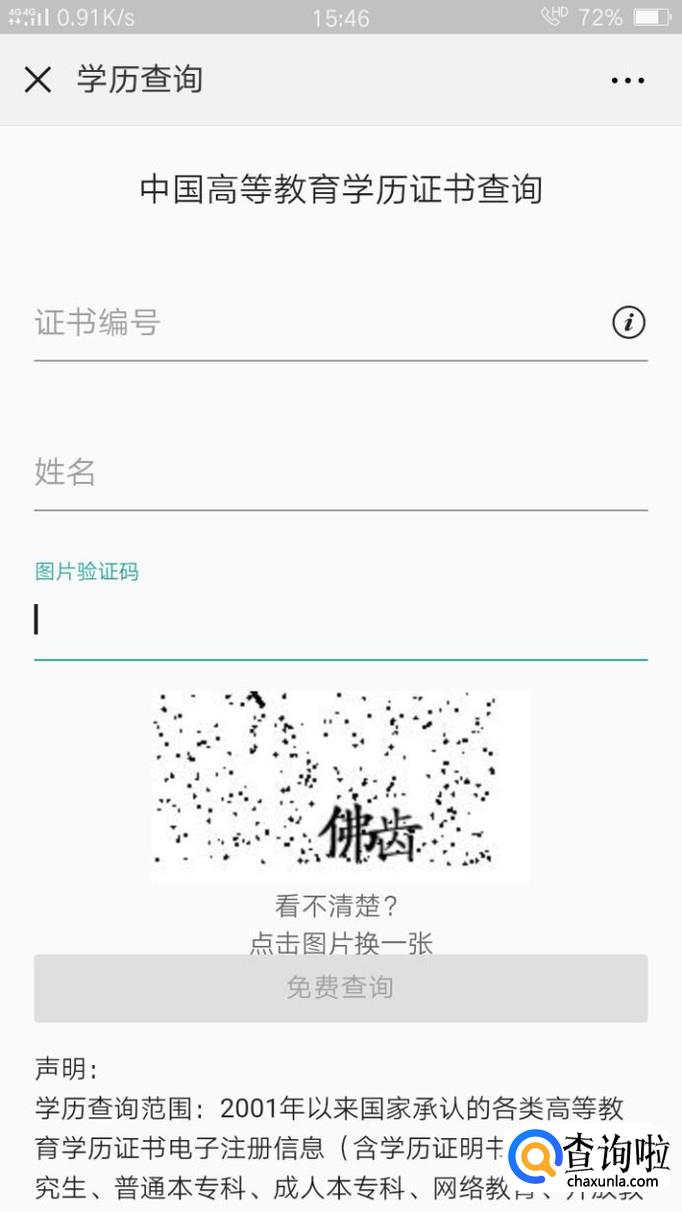 依次输入证书编号、姓名、验证码,点击“免费查询”。