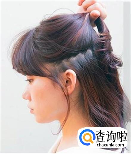 这一款比较常见,但是很显年轻俏丽,直接将头发分成上下,上半部分的头发往脑后上方聚拢,扎起一个半扎发,剩余头发直接披散。