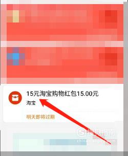 打开支付宝,在首页点击箭头所指“卡包”,随后往下翻找到并点击“15元淘宝购物红包”。