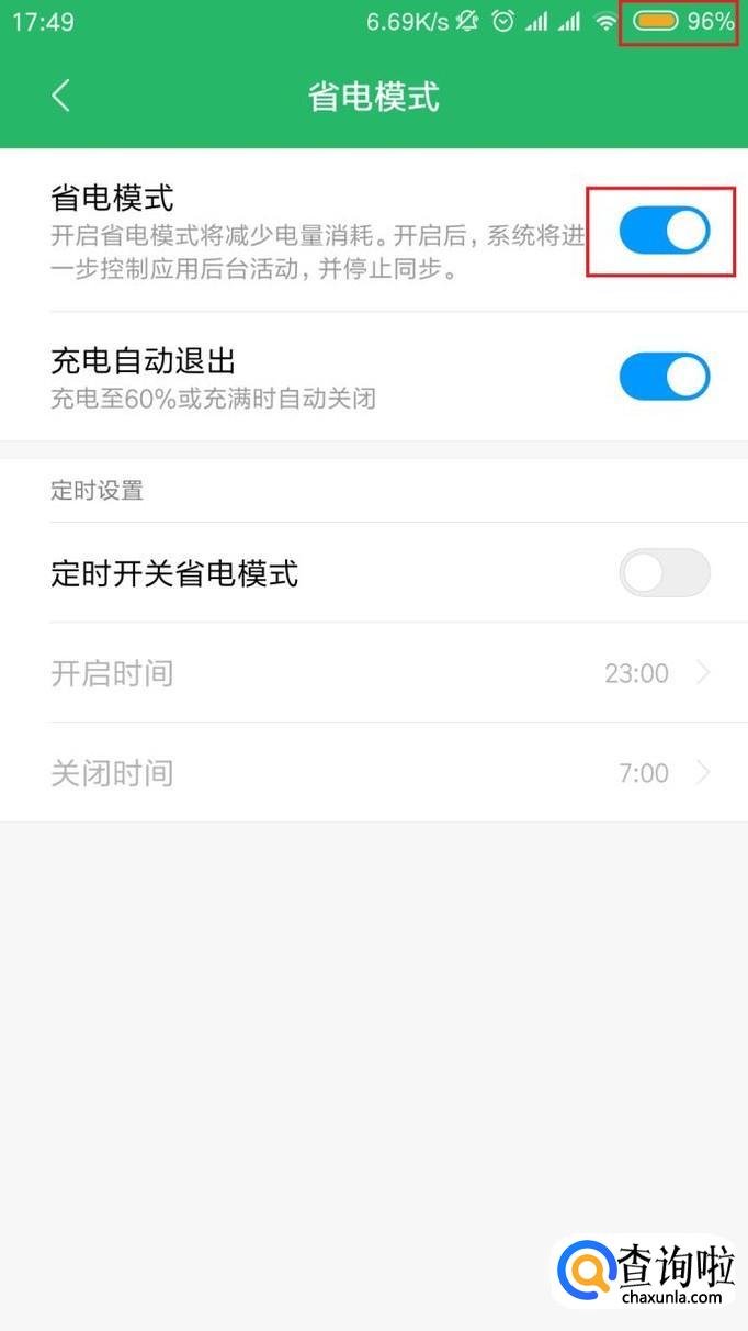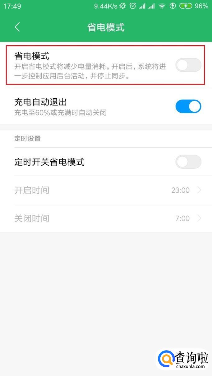 接下来,可以看到省电模式开关默认是处于关闭状态的,点击该功能按钮开关,将其打开。