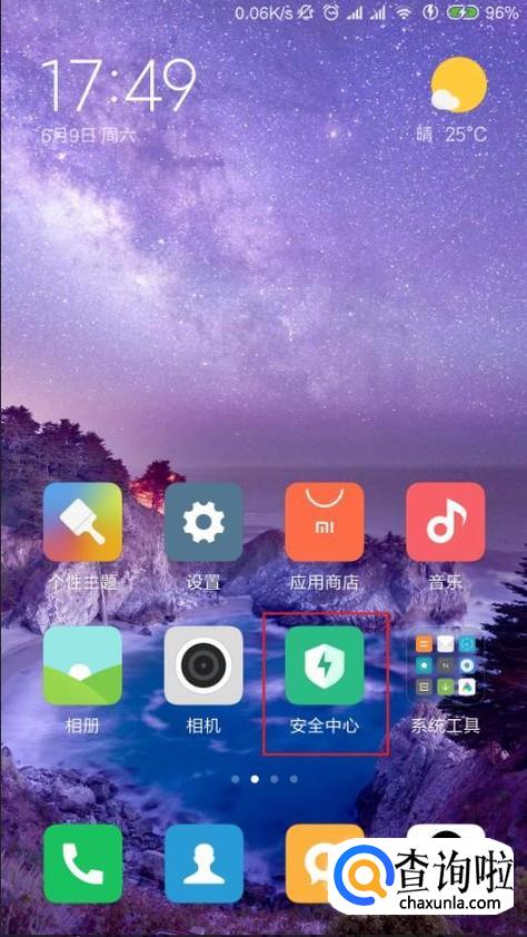 这里以MIUI系统为例,在MIUI系统桌面上点击“安全中心”应用图标,进入安全中心应用主页面。