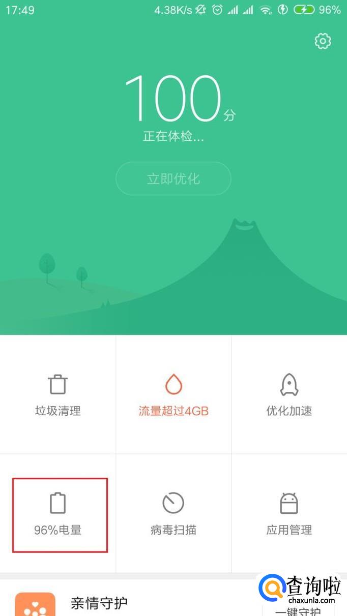 进入安全中心应用主页面之后,点击页面中的“电量”显示功能模块。