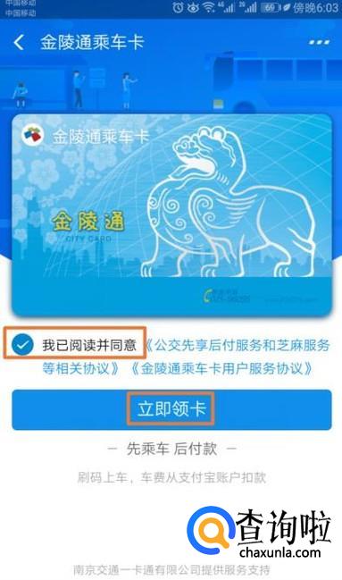 之后我们勾选上我已阅读并同意,然后我们点击立即领卡;