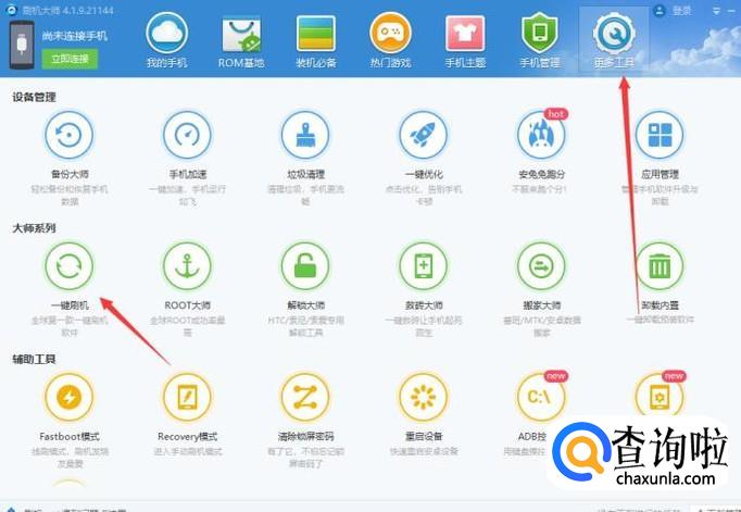 运行刷机大师,开启手机的USB调试模式,然后用USB数据线连接到电脑