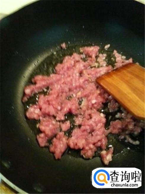锅里留一点点有把肉馅和葱姜蒜放进去炒熟,加上生抽、蚝油以及食盐调味。