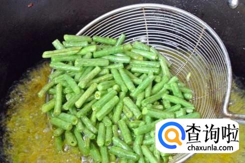 锅里加多一些的油,把豆角放进去炸,直到豆角变色捞出来控油。