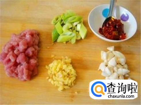 一点瘦肉切成末,准备一些红辣椒切圈,葱姜蒜切碎。