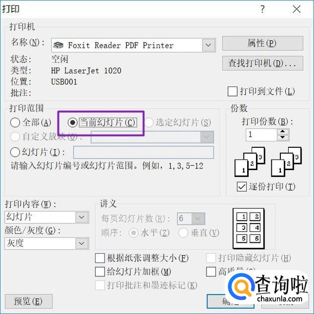 选择好后,我们点击选择下方的打印范围,选择当前幻灯片;