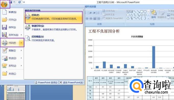 点击左上角的office按钮,选择打印,点击打印;