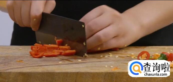 红尖椒对半剖开,去籽,切菱形片。