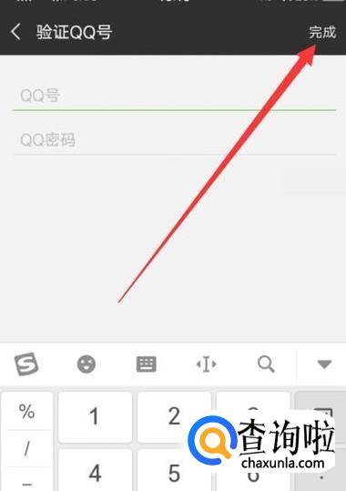进入之后,填写自己的QQ号与密码,点击“完成”即可将QQ与微信绑定在一起,如图所示。