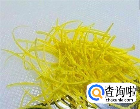 柚子皮清洗一下,用刀切成非常细的柚子皮丝。