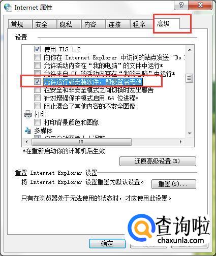 在internet属性窗口中,找到并勾选“允许运行或安装软件,即使签名无效”,点击确定即可。