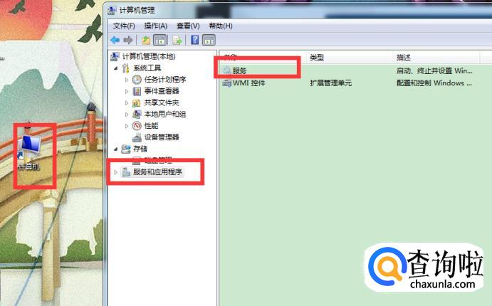 在电脑桌面找到我的电脑鼠标右击管理,如果没有我的电脑,点击计算机找到服务和应用程序,找到服务选项,点击进入服务列表。