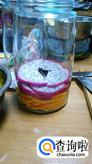 首先我们准备一个干净的玻璃容器,清理干净容器中必须保持无油无水,把所有水果洗净沥干水份削皮待用,火龙果留些红色部分。