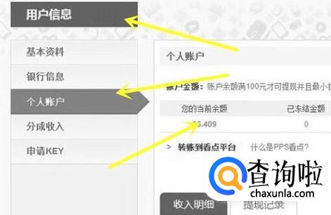 然后我们打开用户信息,在个人账户栏就可以看到我们的分成收入了