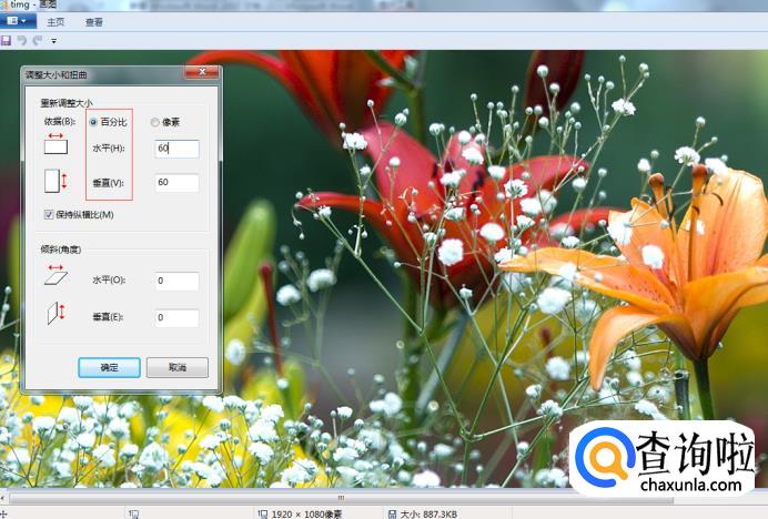 之后我们点击上方菜单栏中的“重新调整大小”,并中“百分比”,之后修改“水平,垂直”两个按钮的数值,最后点击确定。