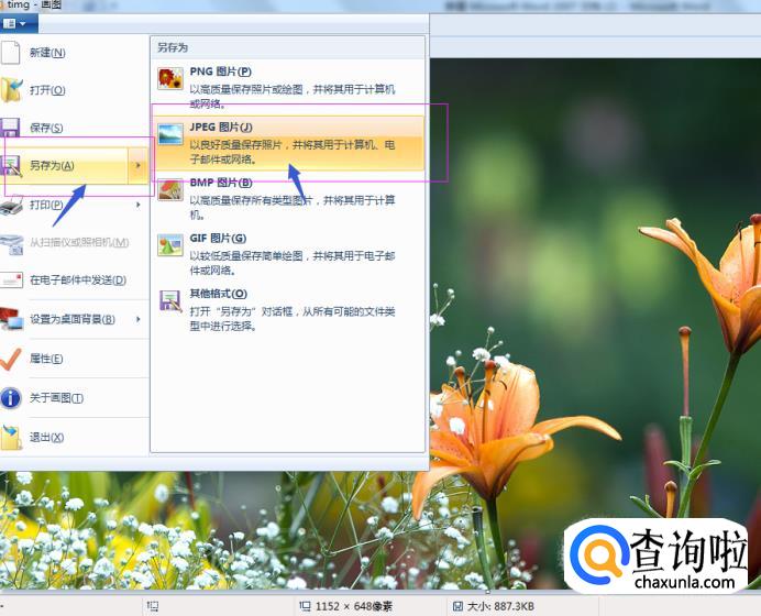 随后点击“另存为”标识,并选择“JPEG”,选择相应的磁盘保存。