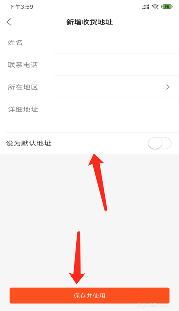 7、按照提示输入地址信息并点击【保存并使用】按扭即可在手机快手视频中新增收货地址。