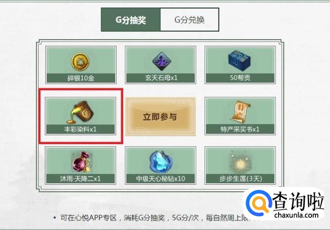 玩家也可以登录心悦会员的天涯明月刀专区,消耗5G分进行抽奖,也将有概率抽到丰彩染料。