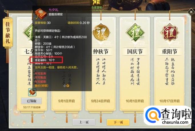每个节日,天刀都会让玩家免费领取对应的节日礼包,开启后将获得各式各样的道具,而丰彩染料则是必有的几种道具之一。