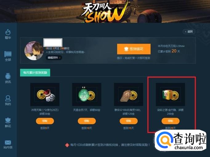 首先便是天刀同人SHOW的签到活动,进入游戏后,点击小地图左上角的“天刀同人SHOW”进行每日签到,累计签到20天后可以领取“染彩之匣·金竹隐”,开启后可以获得丰彩染料。