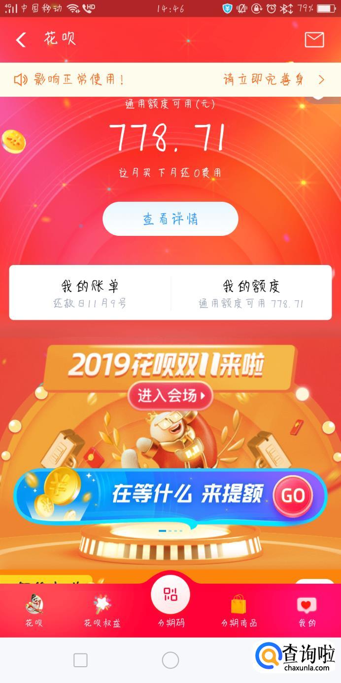 打开花呗之后,我们可以看见关于提额的小对话框,我们点击这个对话框。