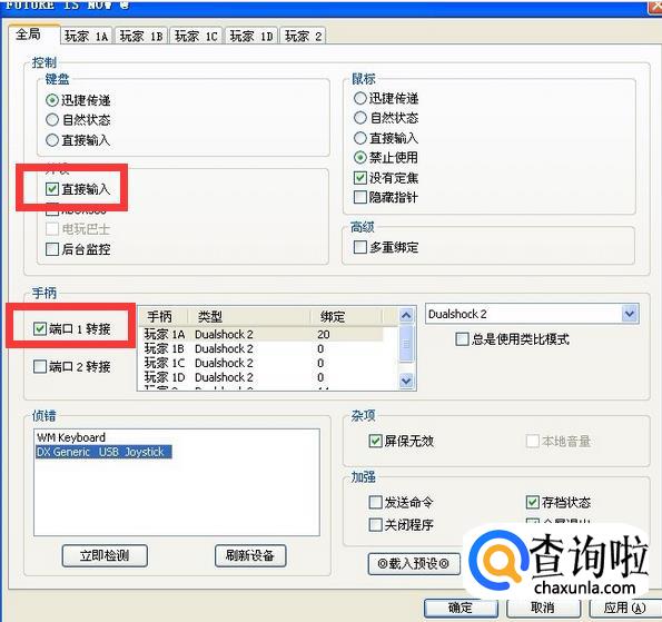 这时就可以进入到手柄的设置界面了,在此界面勾选“直接输入”和“端口1转接”,然后可点击“端口1转接”旁设备栏里的手柄进入手柄的按键设置。