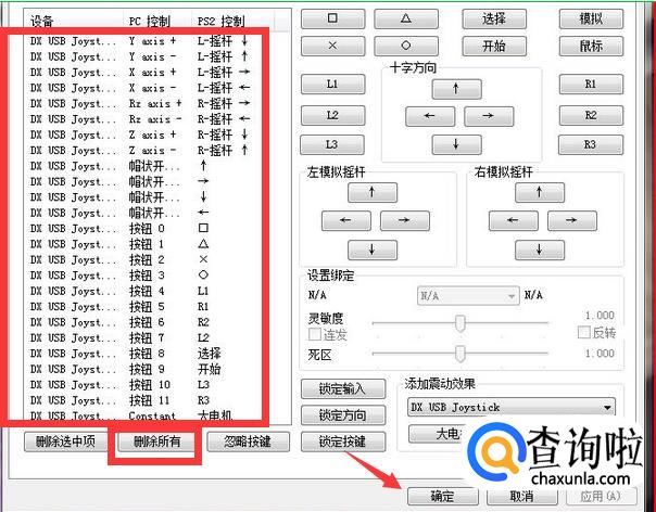 如下所示就是手柄的按键设置界面,在左边红框内把手柄上相应的键给设置上,包括四个附键(L1、L2、R1、R2),八个主键(上、下、左、右、尖尖、框框、叉叉、圈圈),两个摇杆(摇杆按下就是L3和R3键),一个“开始”,一个“选择”,方法是点击一个按钮,按一下手柄上相应的键,如果设置错了也可点击下方的删除来重新进行设置,设置好后点击“确定”。