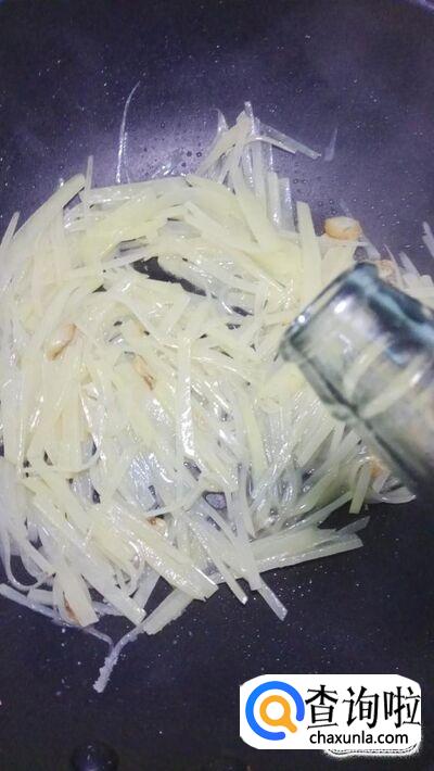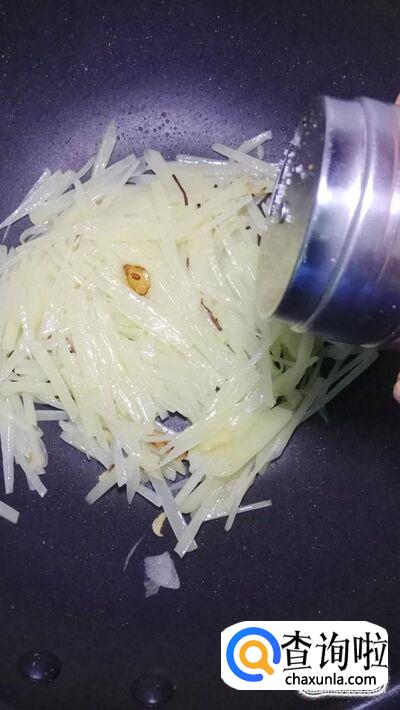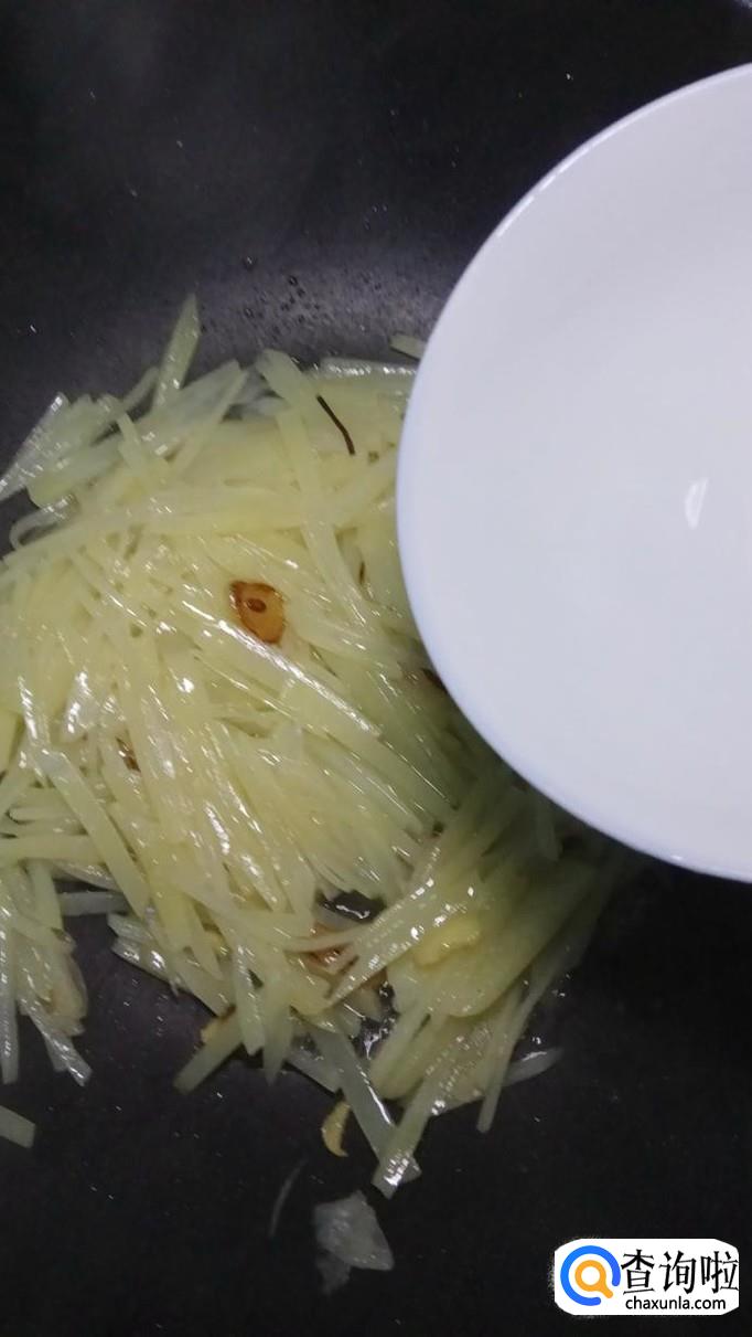 再加入适量盐和白醋,醋不用放的太多,因为土豆丝已经用白醋泡过了,炒一会儿,加少许清水,搅拌均匀。