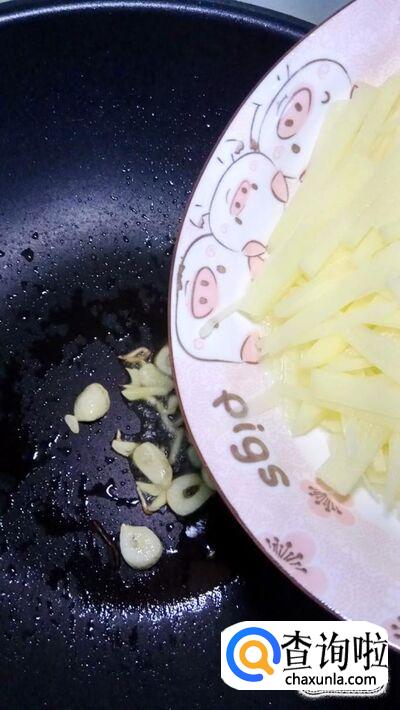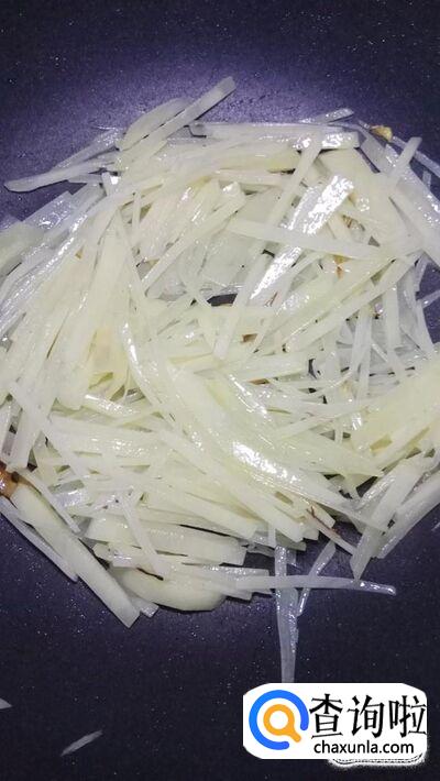 将泡好的土豆丝沥干水分,倒入锅中,搅拌均匀。