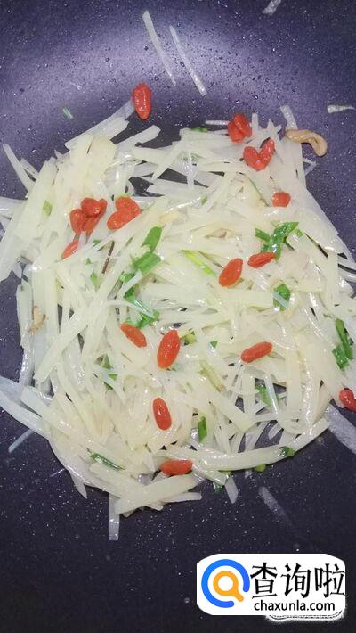 将泡好的枸杞子,倒入锅中,搅拌均匀。枸杞子的营养价值非常高,和土豆放在一起,会让菜肴更加营养。