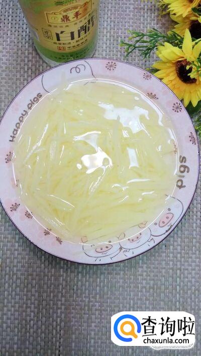 准备一个土豆洗净后去皮,切成细丝,洗去淀粉,碗中加入适量白醋,用清水泡起来,大约泡五分钟左右。用醋泡过的土豆不易炒烂,口感清脆。