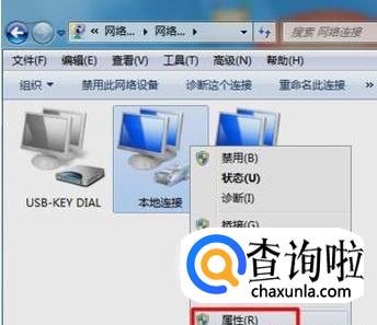 我们还可以将IP获取方法设置为动态获取:右击本地连接,弹出的菜单中选择“属性”项。