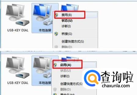 然后右击“本地连接”,禁用并重启启用来尝试解决无法上网的问题。
