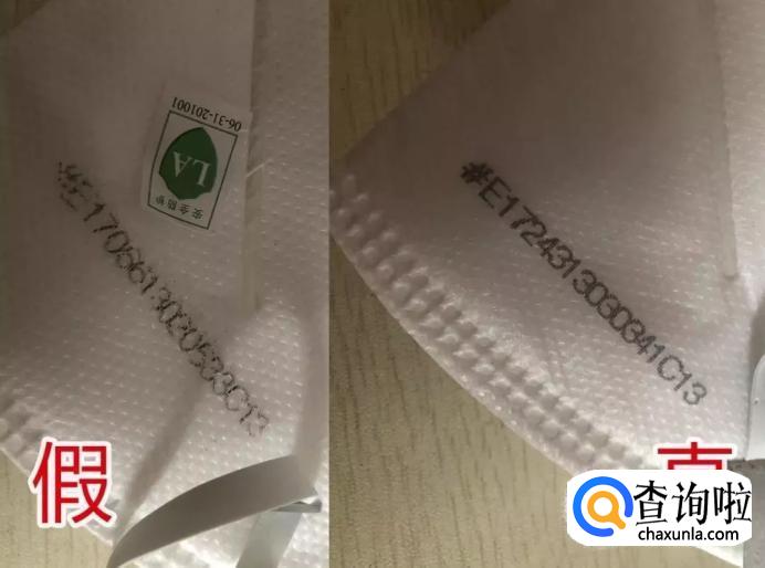 判断完包装,下一步就是判断口罩上的防伪标识,真假标识颜色上基本差不多,直接观察,没有对比的话,几乎无法判断真伪,但仔细对比看的话,你会发现细微的差别。真标识的“安全防护”字样更加细,盾牌LOGO也更加立体,整体来看比假标识要精细,尤其是数字,也更细。这是判断真假口罩非常关键的一个鉴别点。
