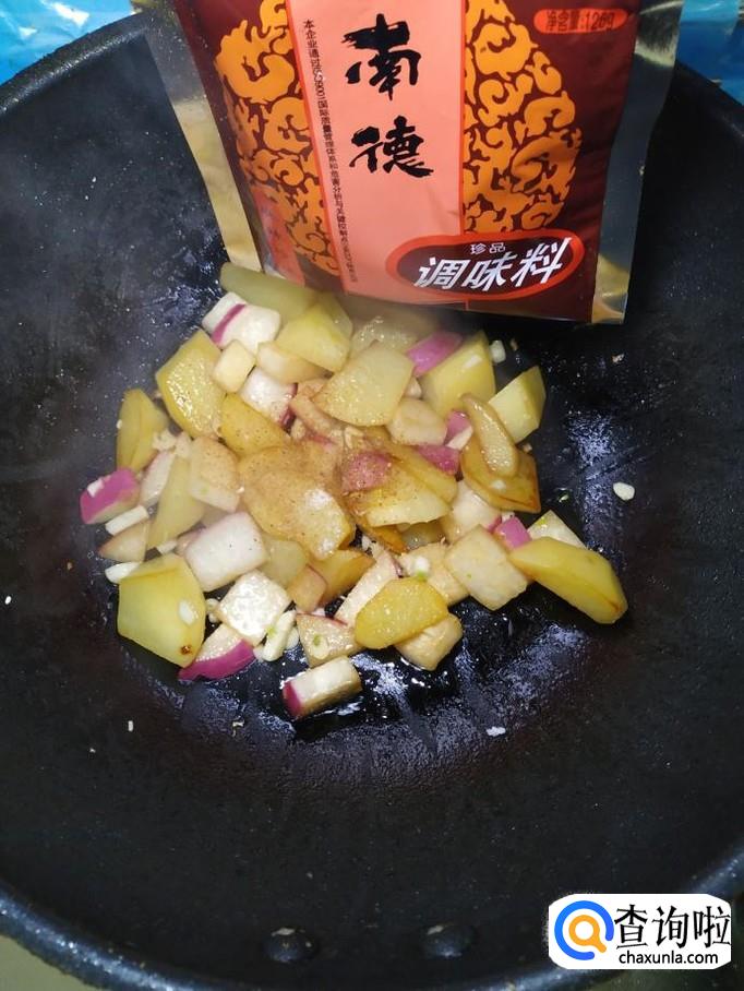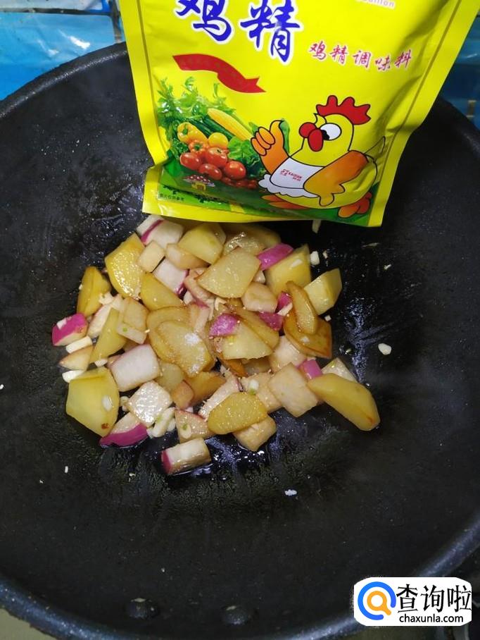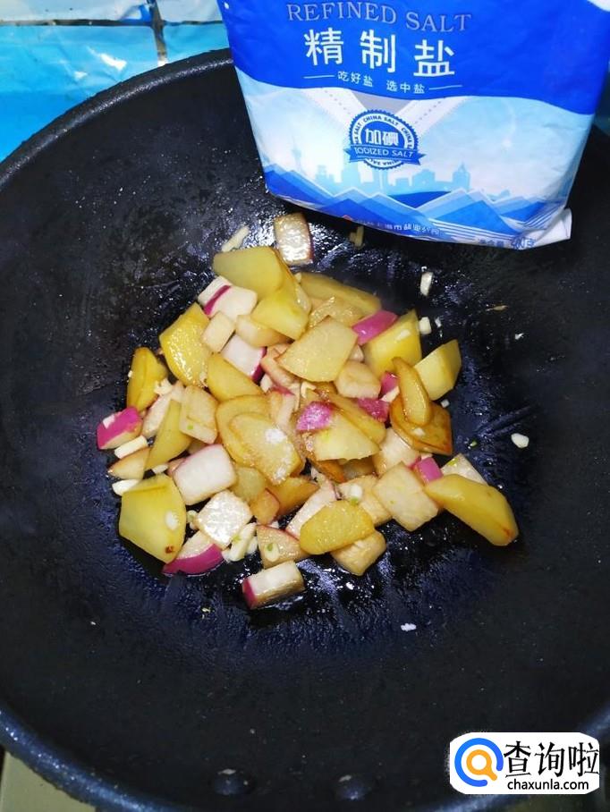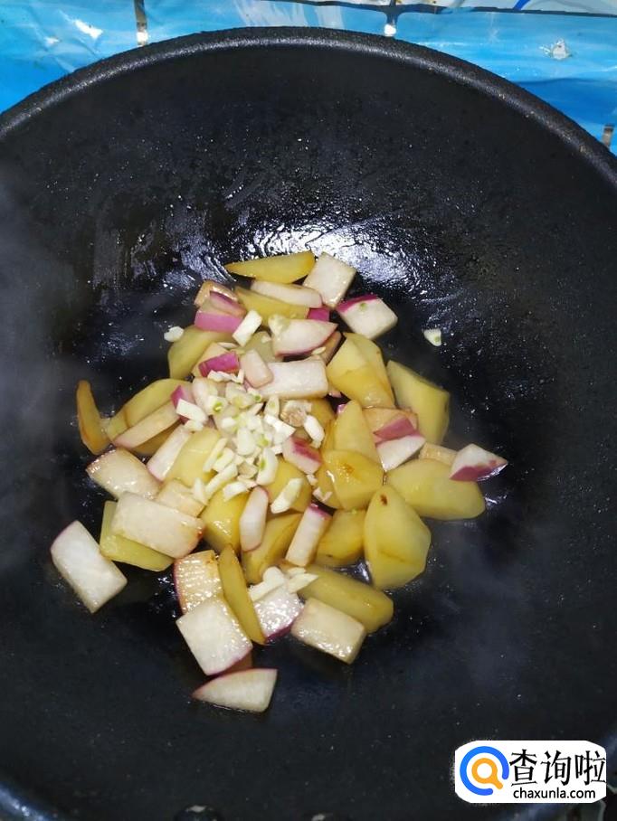 炒至红皮萝卜和土豆表面微微出现焦黄色,准备适量大蒜,去除外衣后,切碎,放在上面,搅拌均匀。