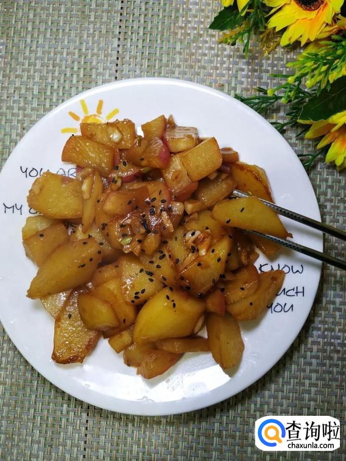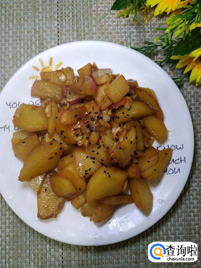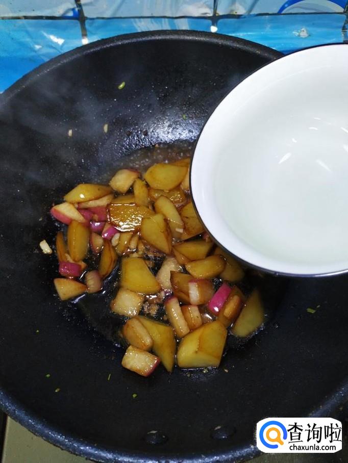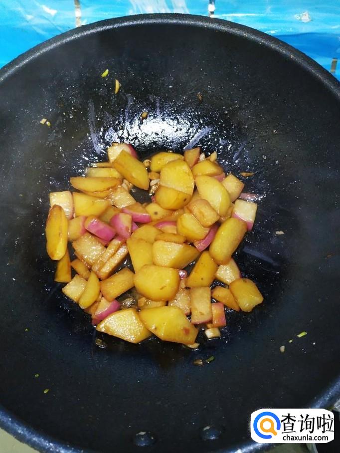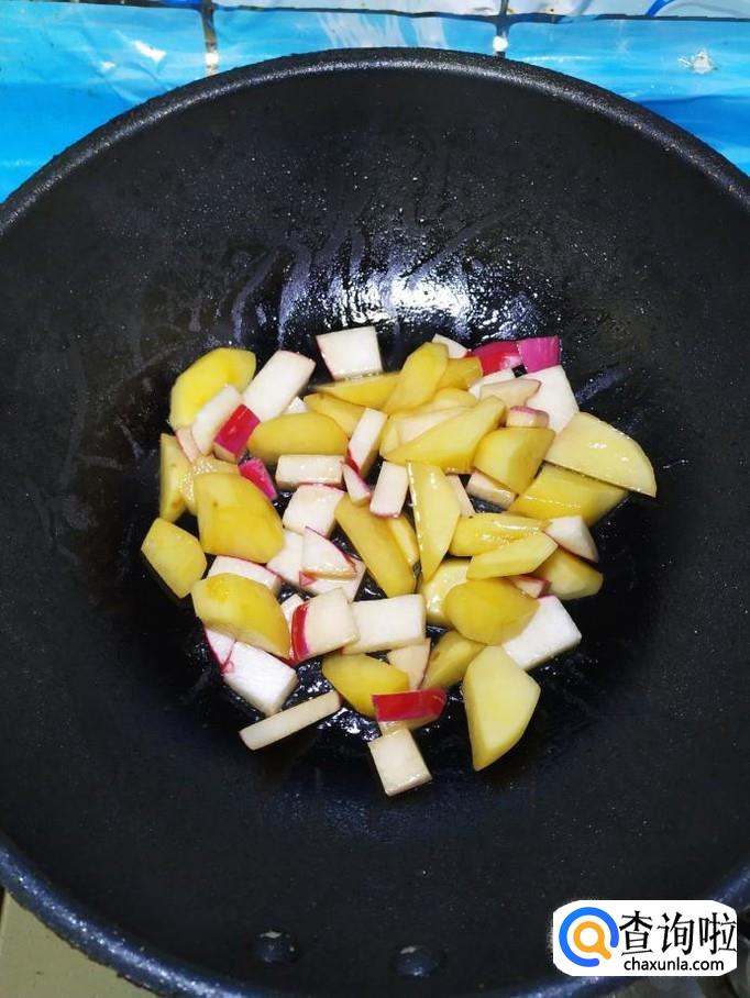 炒锅中放入适量油,油热后,放入适量白砂糖,慢慢的熬出糖色,然后将土豆和红皮萝卜放入锅中,翻炒均匀。