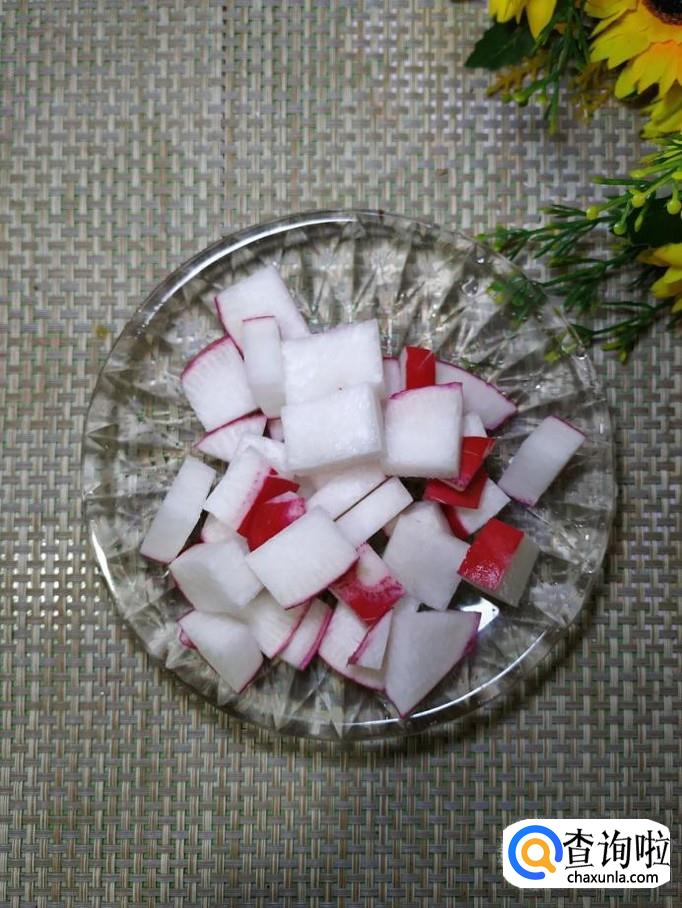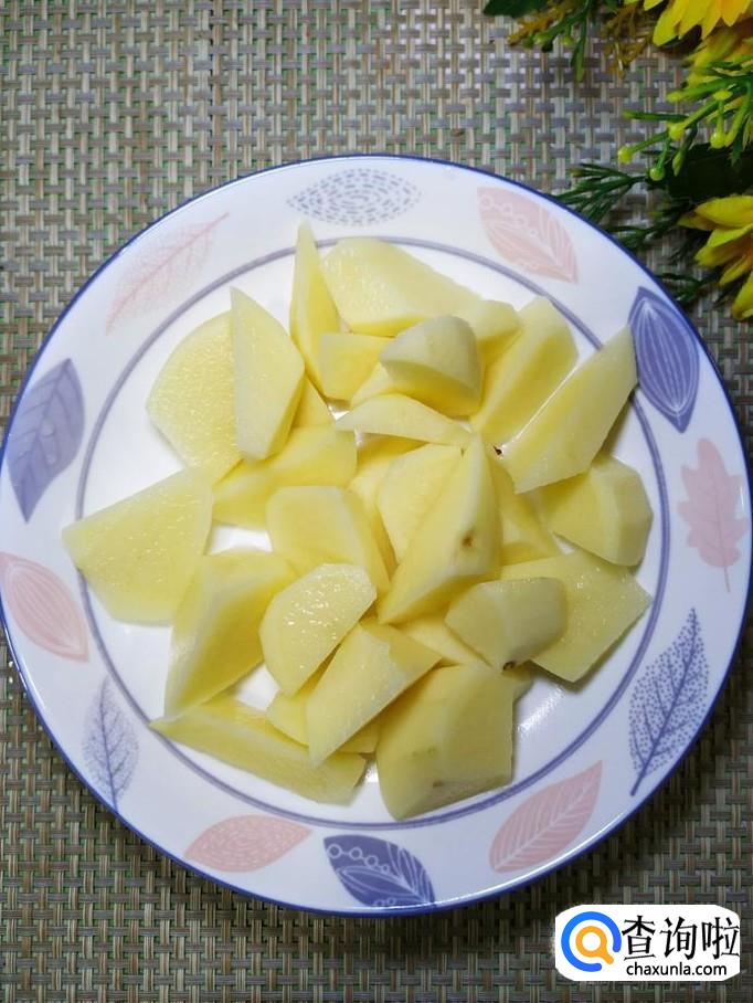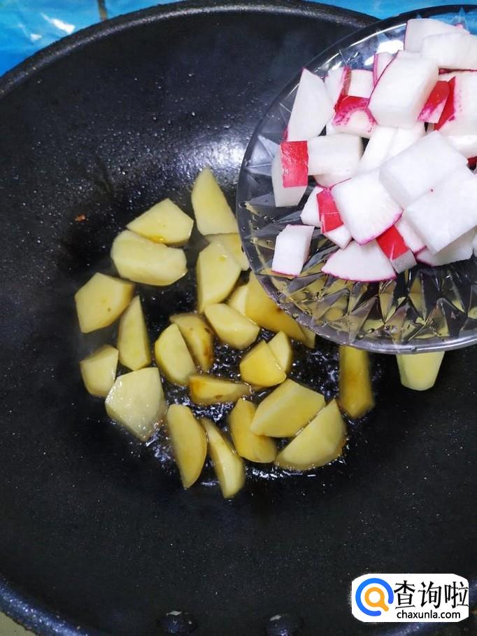 红皮萝卜不用去皮,切成小块,放入盘中备用;将土豆去皮后,切成滚刀块儿,洗去淀粉,放入盘中备用。