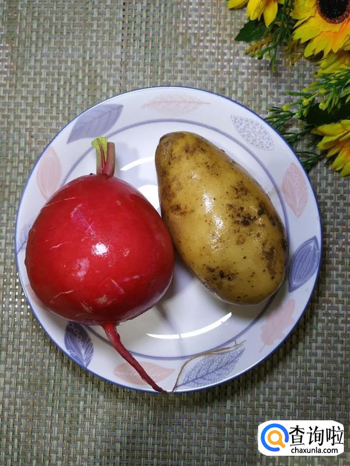 准备一个红皮萝卜和一个土豆,将它们洗净后放入盘中备用。