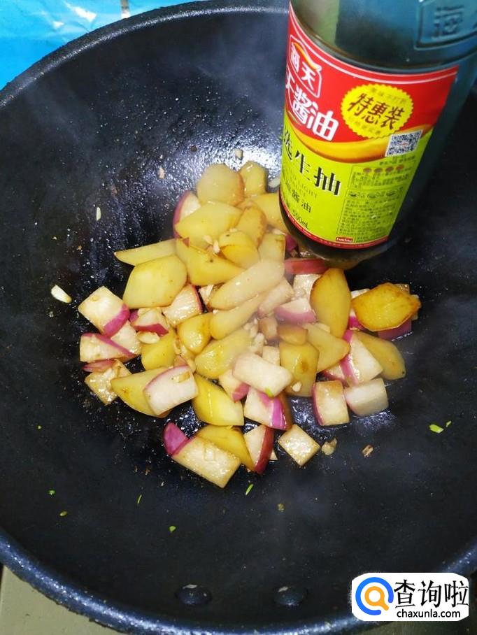 加入适量生抽,增亮色泽,然后加入少许清水,盖上锅盖,慢慢的收干汤汁,将食材炒熟。