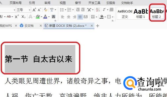 其他各级标题的样式都可以这样修改,修改完成以后,选中文章中的各级标题,点击一下对应的各级标题按钮,就可以快速设置了。如图,我们用鼠标选中某一二级标题的文字,点击上方“标题2”按钮,马上就设置完成了。