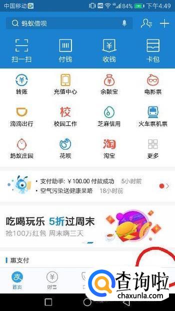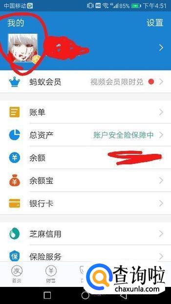 首先,我们先打开支付宝并登陆上自己的账号,然后来到支付宝的主页面(如下图一所示),点击右下角“我的”按键,然后来到自己的页面(如图二所示),点击左上角的头像。