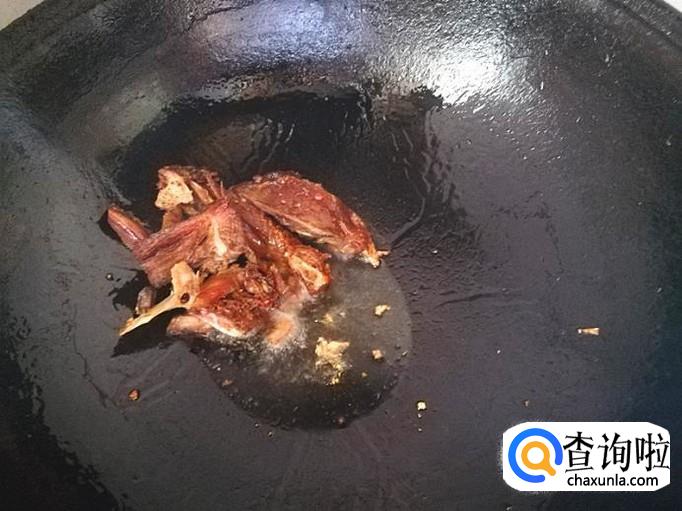 上炒菜锅,加入适量的植物油烧热,倒入融化后的熟鸭肉一起爆炒片刻。